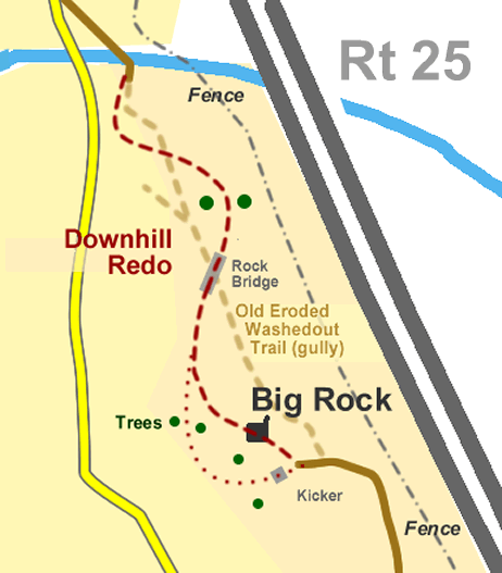 July 17th, 2011 - Trail MaintenanceHappy Ending to a Rough Start The Freeriders (who prefer a bit of anonymity) built a solid rock-armored bridge over gully that the highly-eroded trail had washed out. They built up a clearly-defined path to do an "up and over" across the Big Rock as well. Together, we benched out a nice smooth-curved fast-flowing line and moved deadfall to define the lines. Mini Map >> Please respect this reroute. Long before Walmart had Chinese full-suspension spin offs and mountain biking became a household word, there were a few adventurous Riders in the Valley, exploring, armoring and blazing challenging yet