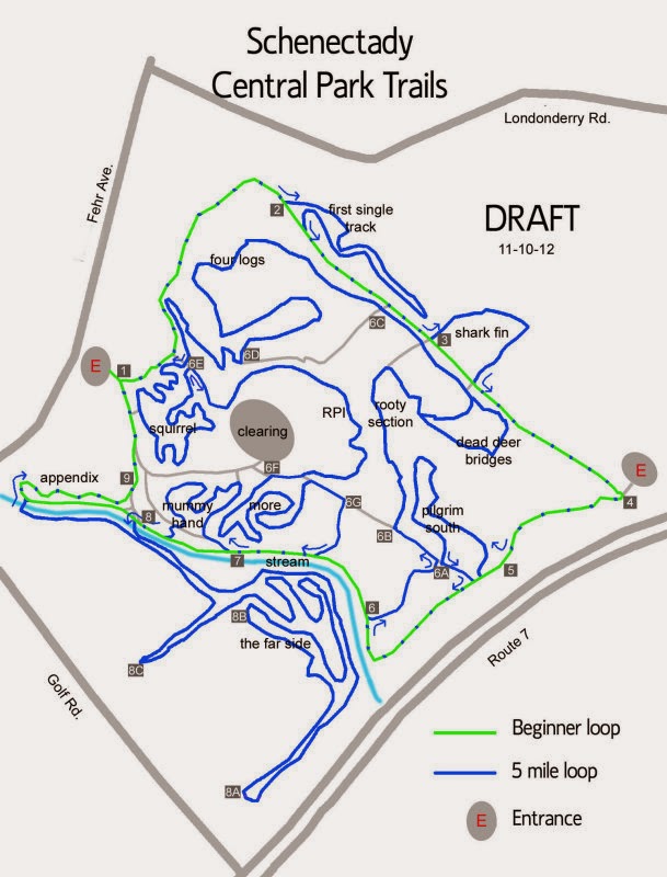 Although this is a small area, with frequent sharp turns and switchbacks it packs in about 5 miles of fun riding. It's best to follow the most well-beaten trail, indicated by the green arrows. Many of the trails glide up and over forested small hills that are actually sandy dunes. There is hardly any rock but lots of roots everywhere keep it interesting. In the lower flat areas, quite a few boardwalks of all different sizes offer an additional riding challenge. Lots of stretches are on an incline and fast and flowing to really get your speed up. It's a fun place to ride - park on Fehr Avenue.