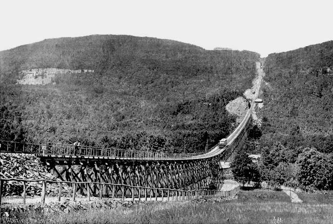 Shortly thereafter, at the other primary steamship stop, a narrow gauge railroad was built out of Catskill, NY aptly called the Catskill Mountain Railway. While the railroad served its purpose of bringing passengers closer to the mountain top resorts, it still left them with an arduous hour-long stage trip up the face of the Catskill Escarpment (also known as the Wall of Manitou).