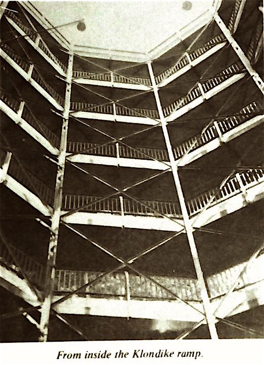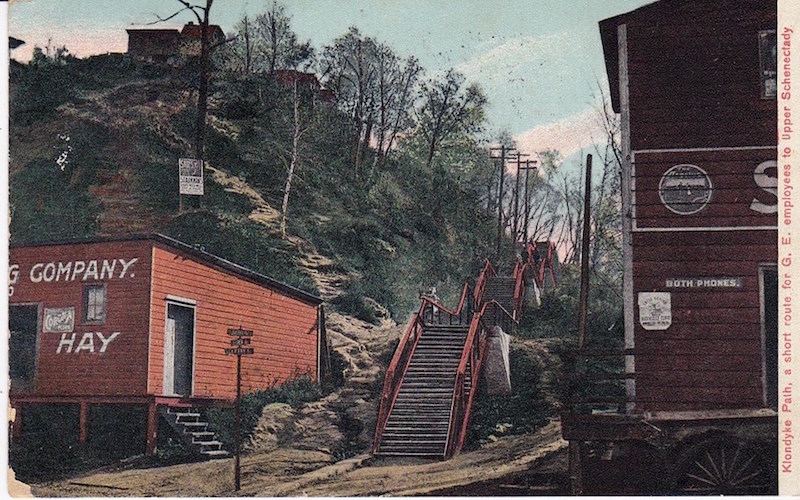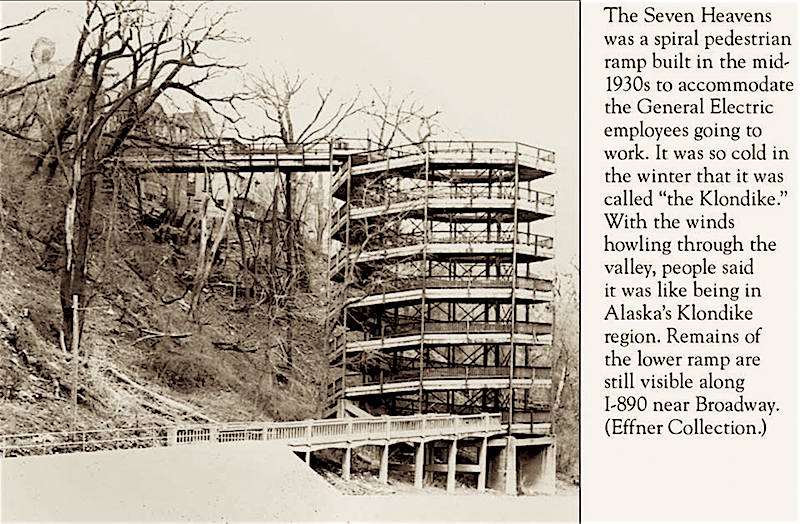 The Klondike Ramp was an eight-story circular walkway that carried General Electric workers to and from Hamilton Hill. It was built in 1931 and demolished in August 1958. A few vestiges of it are still visible from the Broadway exit ramp 5 off I-890.