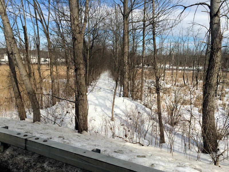 A section of the ROW north of Lake Lonely has been turned into a trail.Behind Longfellows Restaurant, the trail turns southward to Lake Lonely. Further info below.