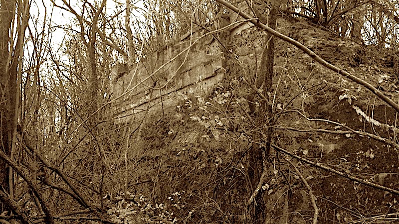 I returned on May 21st, 2014 and snapped some photos of the southside abutment with the intention of building a "then and now" photo comparison. It is amazing—as you will see below with the slider feature—just now much nature has "taken over". What was once a farmer's field is now dense woods and the bridge abutments—while still there—are cloaked in an entanglement of vines, scrub and tree growth.