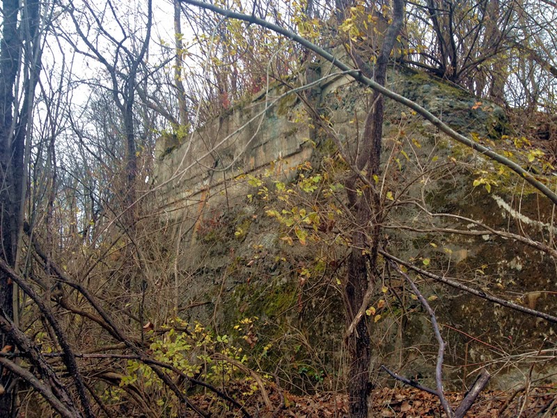 [Autumn 2013] - Ever since I saw this old abutment (click on thumbnail on the left) in the woods while heading toward Aqueduct riding by on the Mohawk-Hudson Bike Trail, I was intrigued. Curious as to its origin, I made an inquiry to the Railroad Experts and quickly got an answer. This was the right of way (ROW) for the interurban line (Schenectady Railway) over the Troy & Schenectady Railroad as it headed towards its bridge over the Mohawk. There is a photo of the Schenectady Railway trestle as it curves over the Troy & Schenectady Railroad on Gino DiCarlo's site. The northside bridge abutment I spotted would be off Gino's photo on the right.