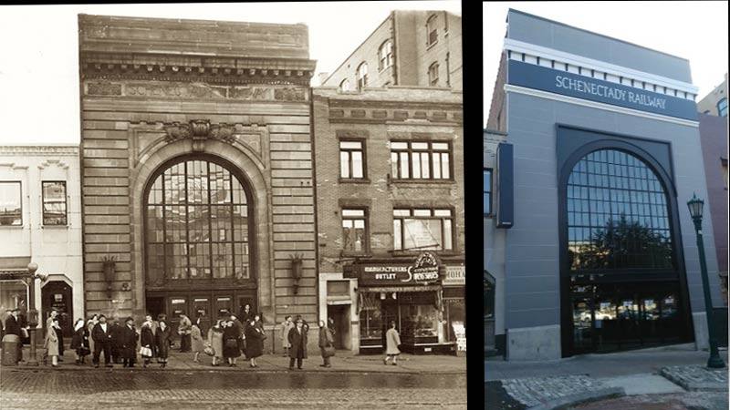 The Schenectady Railway Building, designed by noted architect Marcus T. Reynolds, was a monumental stone and brick masonry building and featured a dramatic front arched window and cavernous waiting room. From 1913 through the 1930s, it was the bustling hub of the Schenectady Railway trolley system.