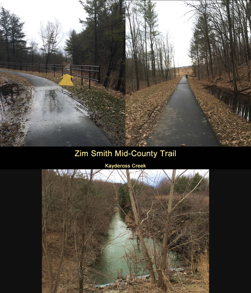 At the bottom of the curve, you can see where the trolley line continued south to Goldfoot Road thru private property. This stretch of the highly developed1 Rail Trail Connector parallels the Kayaderosseras2 Creek and we were blessed with seeing a few blue herons in the trees and on the river. There is even a steep path down to the water’s edge. ["Mystery Rusty Metal Things" Sidebar ]