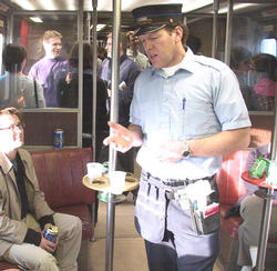 Commuters line up along the bar hanging on to the vinyl bumpers as they jostle to the rhythm of the train. "$3.50 please" says Robert Hidalgo as he slams down a wet can of beer for a businessman groping for his wallet. Hidalgo's blue Metro Transit Authority polo shirt is unbuttoned just enough to expose a thick gold chain around his neck. He's been a bartender for the Metro North for 12 years. "Some (bartenders) have been here for 30 years," he says.