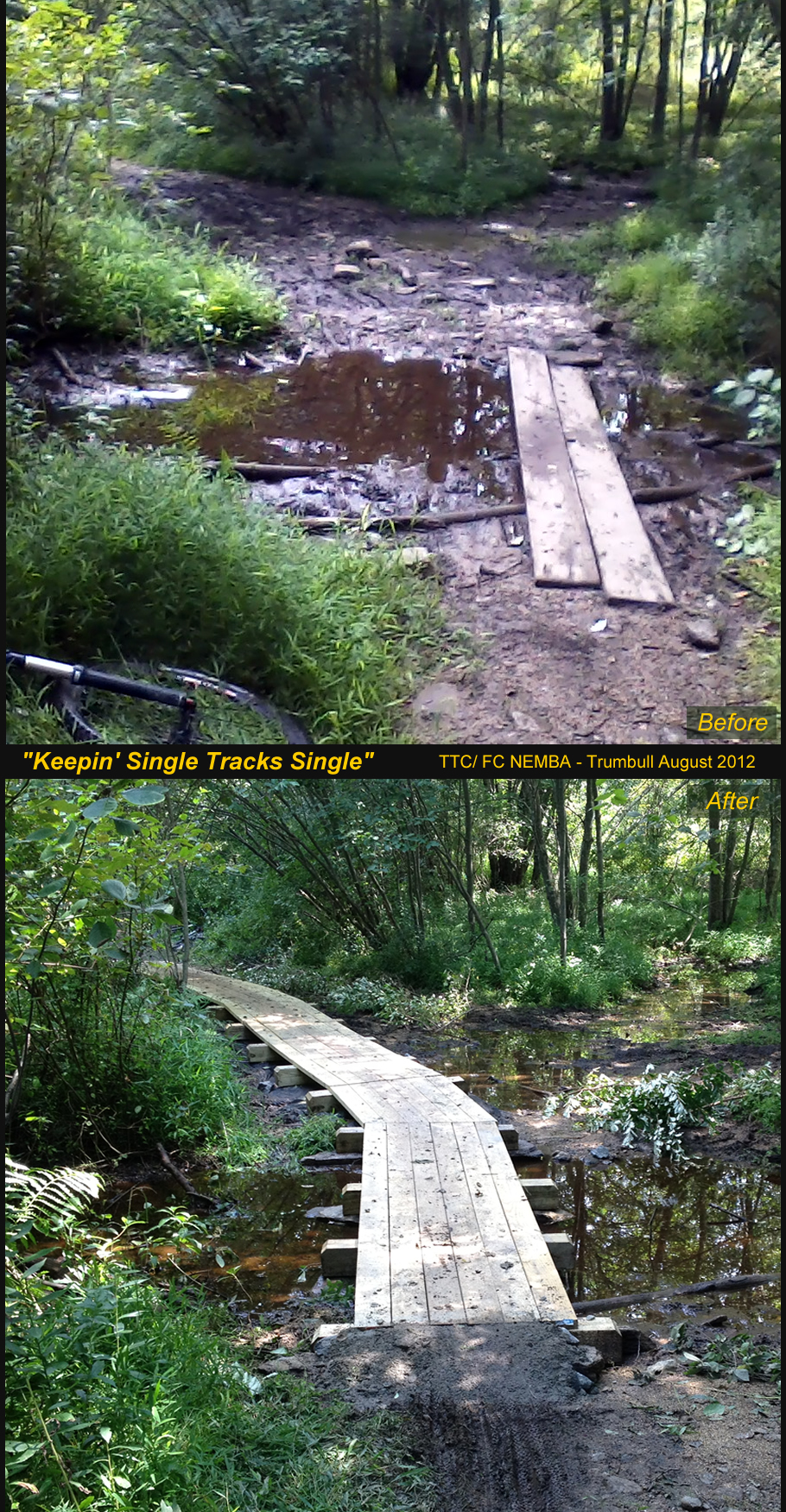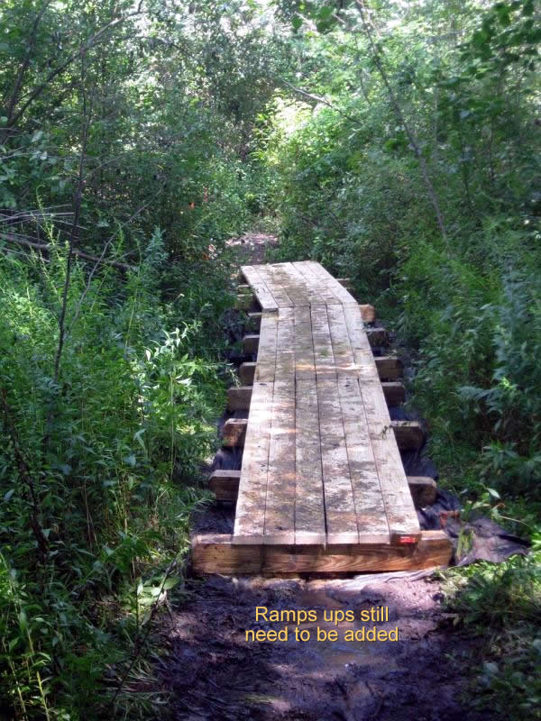 The swampy area in the old lake bed has been a disaster area for too long so we teamed up with the Town to fix it. A boardwalk (a.k.a. Environmental Decking) was the only logical solution. Long in the planning, the Town furnished the lumber and our volunteer efforts (local riders, TTC and FC NEMBA) put it together.