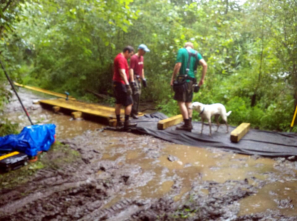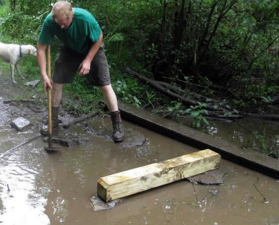 Once the deck was completed, another section nearby that was a huge puddle was "stone-floated and decked" as well. Meanwhile, even further back up the Trail, Tom Ebersold spent some time trimming back the overgrowth along the trail and then focused on clearing a path for consistent water flow (This whole section had been a nasty mess for some time...).